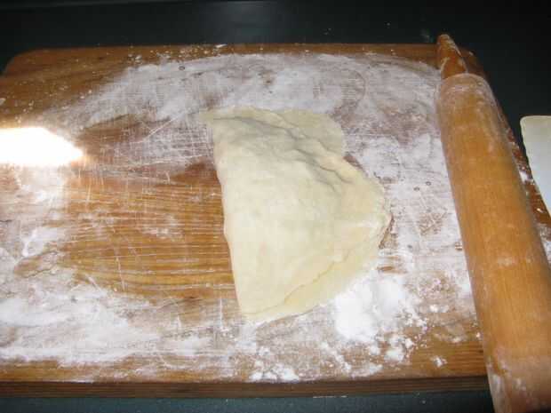 Voltear la masa y cubrir la masa, junta y amasar con la harina y rodar otra vez. Repetir este proceso hasta que la masa del grosor deseado y cerca de seis pulgadas a través.