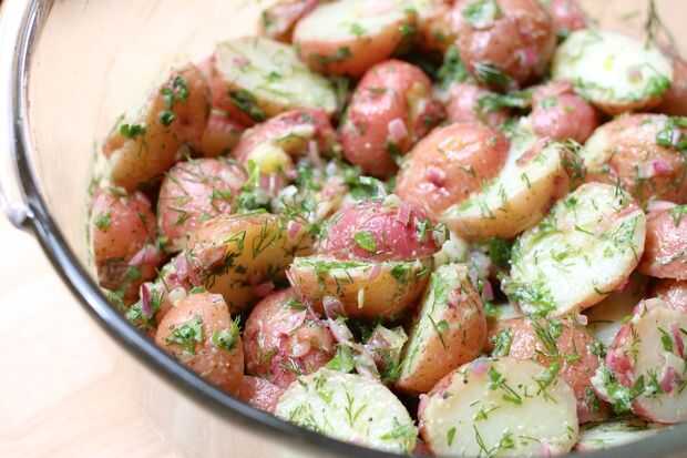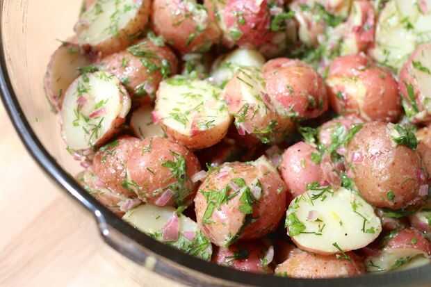 Esta ensalada de patatas con hierbas es agradable y ligero con un montón de sabor - no mayo involucrados, sólo una vinagreta y algunas hierbas frescas. Perfecto para comidas y reuniones. : D