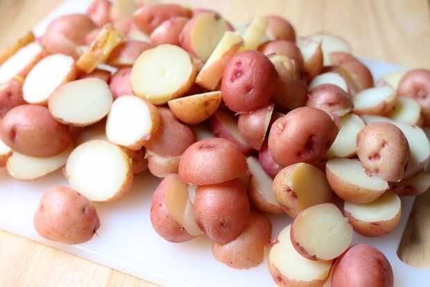 Una vez que las patatas estén frías, cortarlas en trozos de tamaño. Algunos corté justo en medio, más grandes cortar tres.