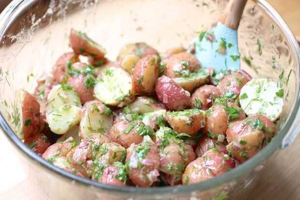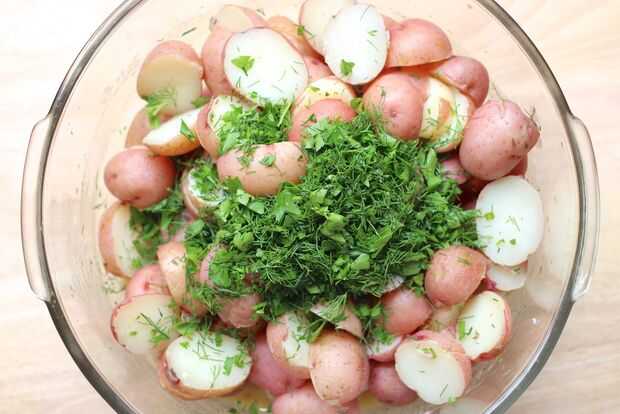 Añadir las patatas en el recipiente en la parte superior del apósito. Picar finamente las hierbas y añadir en la parte superior. Normalmente agrego un crack de pimienta negra en la parte superior también.