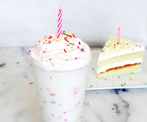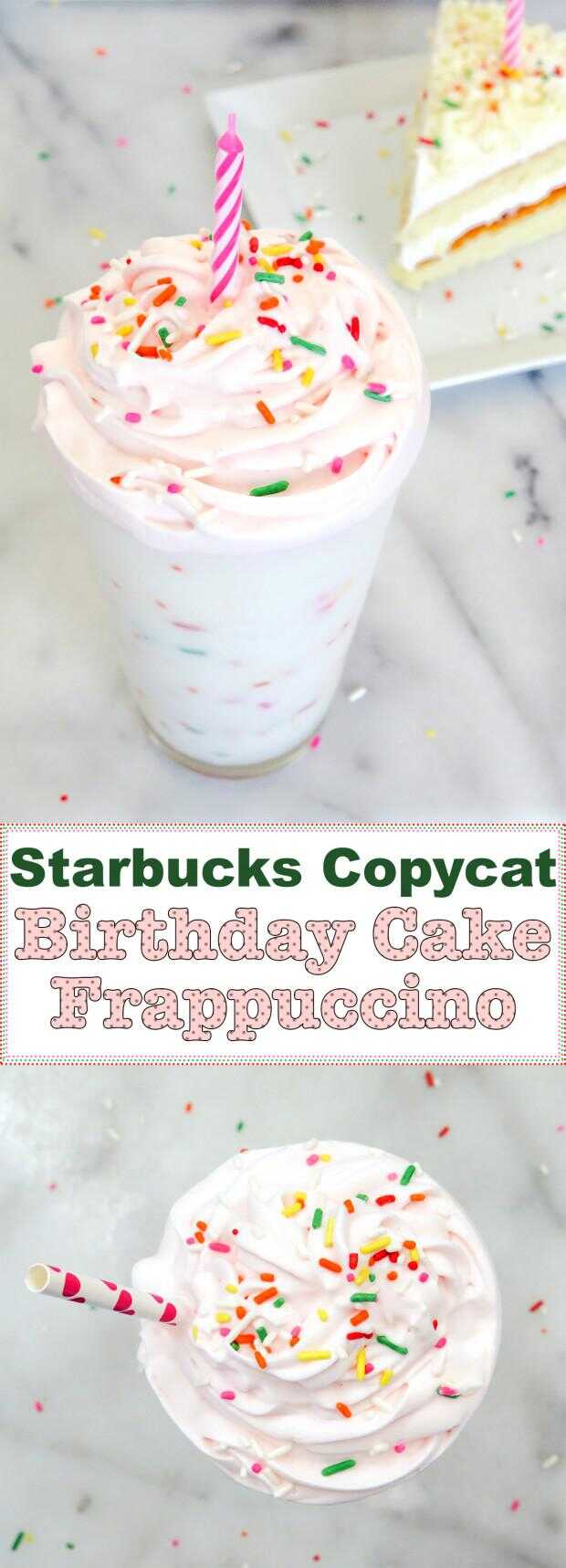 Starbucks Frappuccino de pastel de cumpleaños fue introducido hace un año para el 20 aniversario de Starbucks. Es un frappuccino de cafeína muy sabroso que mezcla la vainilla y avellana y se remata con una nata de frambuesa. Debido a su popularidad, decidieron ofrecer otra vez este año!