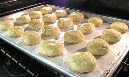 ¿2. al día siguiente, precalentar el horno a 425? ¿F (220? C). en una superficie enharinada generosamente (la masa estará pegajosa), estirar la masa a 1/2-pulgada (1 cm) de espesor y plegar la masa por la mitad, presionando suavemente. Con un 2 pulgadas (5 cm) redondo cortador, cortar galletas y colocar en una placa para horno forrada con. Hornear 10 a 12 minutos, hasta que apenas doren.
