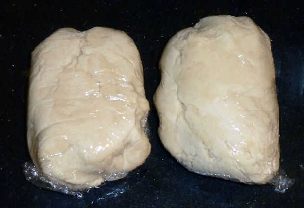 Separar la masa en mitades y envolver en plástico o tienda en tupperware. Refrigerar hasta que la masa esté firme como un palo de mantequilla.