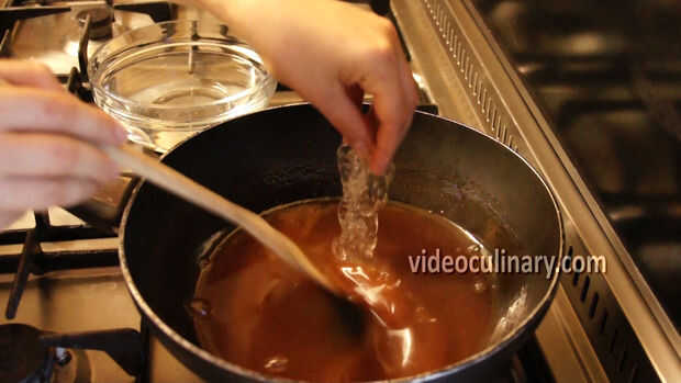 Apagar el fuego. Mezclar el almidón y el agua y añadir en el glaseado de caramelo caliente. Escurrir y añadir las hojas de gelatina. Revuelva para combinar.