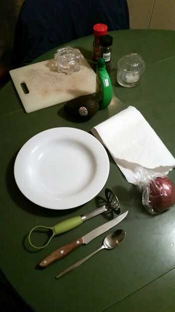 necesita un aguacate maduro, jugo de limón, cilantro deshidratado, copos de pimiento rojo seco, cebolla, sal, pimienta negra molida, ajo, aguacate masher, cuchillo, cuchara, toallas de papel