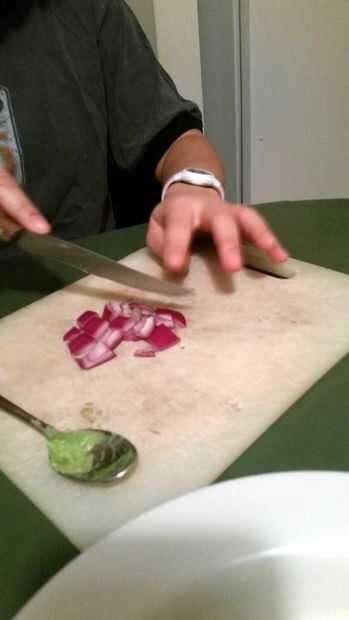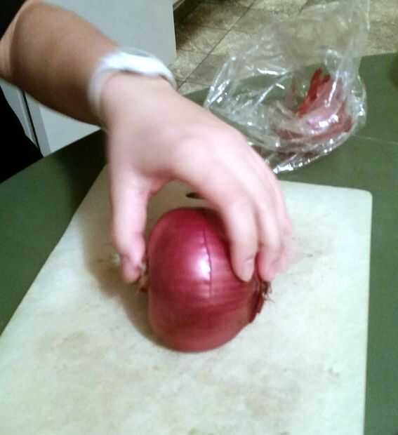 cortar aproximadamente 1/2-1 cucharada de cebolla roja o blanca.