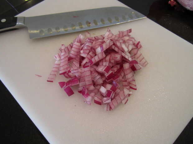 Dados 1/4 de la cebolla roja finamente y dejar caer.