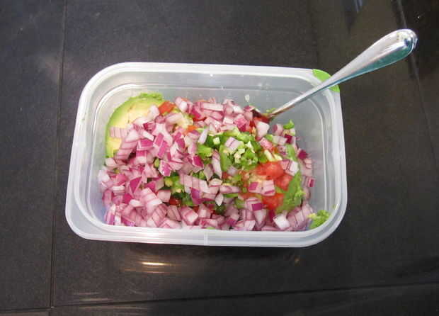 (Utilizando esta cebolla mucho rojo es delicioso y también parece que le Dore como rápida. Decidí poner en cebolla roja extra después de ver este video: http://www.chow.com/food-news/55278/how-to-prevent-an-avocado-from-browning/ y creo que funciona.)