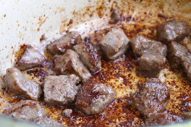 Calentar dos cucharadas de aceite en una olla grande a fuego medio/alto y luego agregar la carne en tandas. Desea obtener agradable y marrón por todos lados. Una vez cada lote es de color marrón, transferirlas a una placa de descanso. Esta es la parte más tediosa pero es la clave para un guiso sabroso!