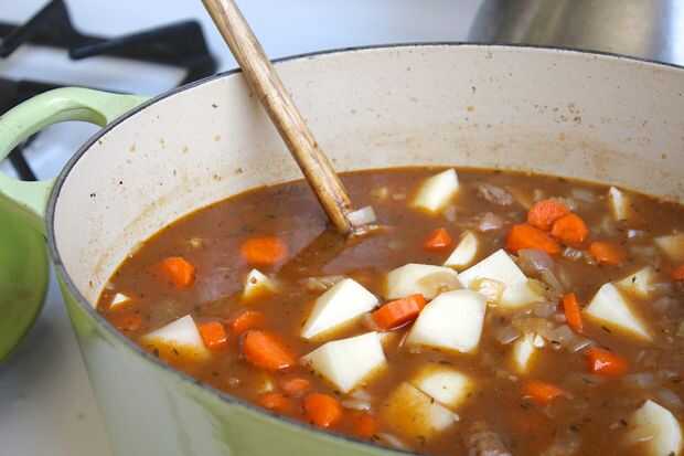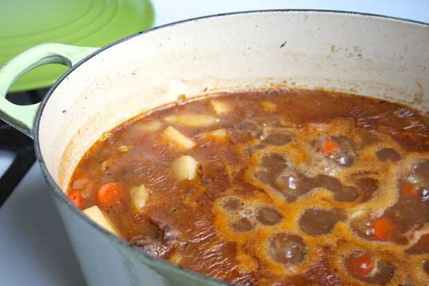 Reducirá el stock y las papas comienzan a descomponer y espesar el guiso. También se formará una piel grasa en la parte superior, que yo siempre nivelado apagado porque no soy un fan de lo que parece ni se siente.