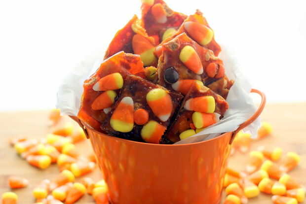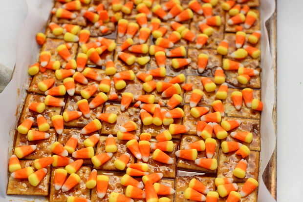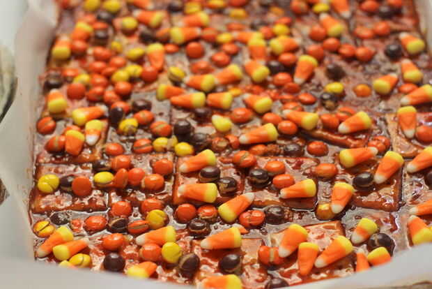 Hornear durante 3-5 minutos. Retirar del horno y apagar el horno. Espolvorear caramelos de mantequilla de maní y maíz de caramelo de toffee; volver a colocar en el horno. El horno no necesita ser dado vuelta detrás este proceso o habrán derretido maíz de caramelo gooey. Deje que el caramelo dulces de maíz y mantequilla de maní a ponerte el caramelo en el horno caliente. Unos 3-6 minutos, una vez hechos Retire del horno deje enfriar completamente y se romperá en pedazos.