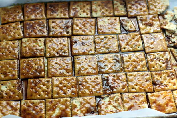 Instrucciones de la receta: Precalienta el horno a 400° F. Línea una bandeja con papel sulfurizado o papel de aluminio; línea una vez hecha el pan con capa de galletas saladas. En una cacerola, mezclar la mantequilla y el azúcar. Poner a hervir sobre media-alta y hervir durante unos 3 minutos hasta que se disuelvan los ingredientes. Verter inmediatamente sobre el sorbeto para cubrir galletas completamente.