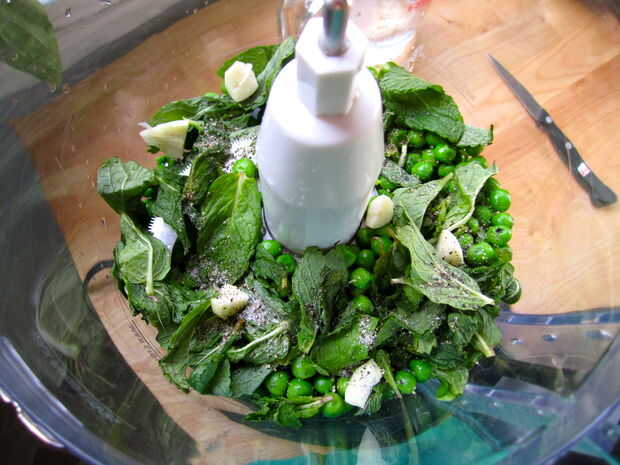 Pelar el ajo y romperlo en pedazos y tirarlo en el procesador de alimentos junto con los guisantes y menta. Añadir una buena pizca de sal y un poco de pimienta molida.