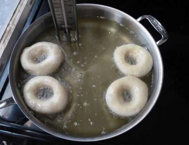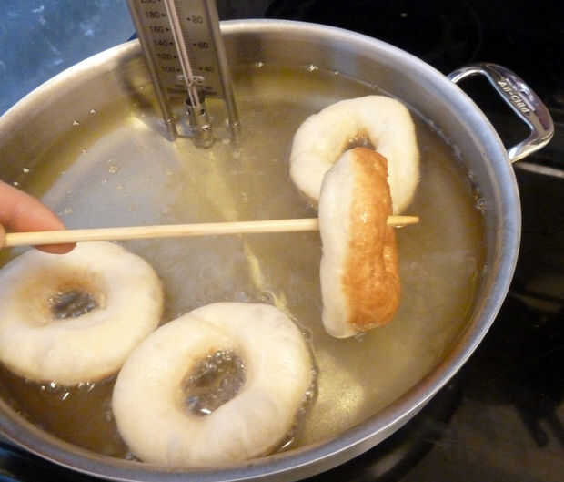 Me gusta usar un pedazo de donut primero para probar diferentes tiempos de frituras.