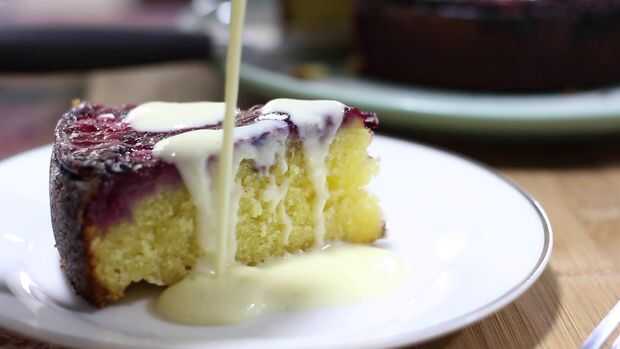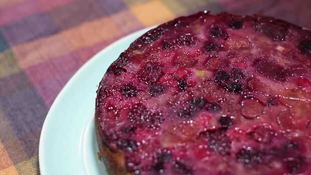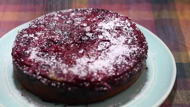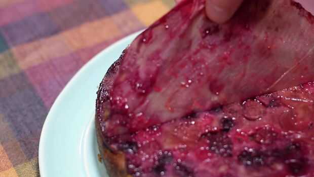 Esta es mi parte favorita, a veces más de comer el pastel. Retire el papel de grasa prueba para revelar que el color brillante al horno fruta. Para dar un brillo encantador, espolvorear con glaseado de azúcar que se derrite / disolver un poco para el brillo.