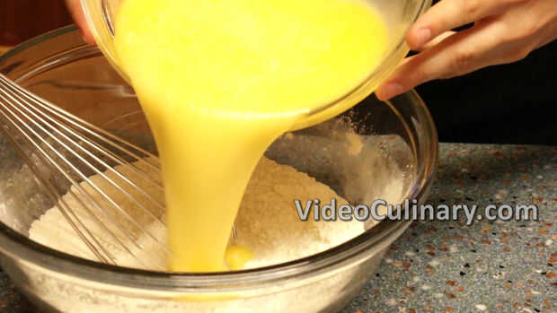 Añadir una pizca de sal y 250 gramos de azúcar granulada. En un tazón separado, mezclar 3 huevos, una cucharadita de extracto de vainilla, 150 ml de leche y 150 gramos de mantequilla derretida.