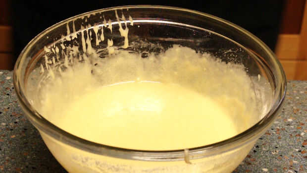 Añadir los ingredientes húmedos a los ingredientes secos y mezclar con un batidor hasta que se combinan. Tarda menos de un minuto para mezclar la masa.