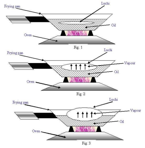 Este es un uso simple de vaporización del agua. Cuando pones la luchi en aceite caliente, el agua dentro de la masa vaporizado y tratar de salir. Y causa la luchi a puff.