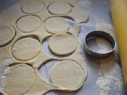 Use un 3" redondo cortador de galletas para recortar tantos discos de masa como sea posible. Amasar la masa restante y repetir.