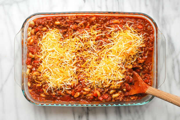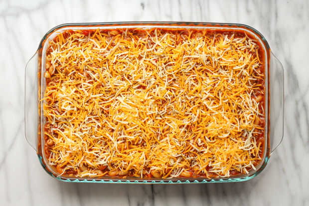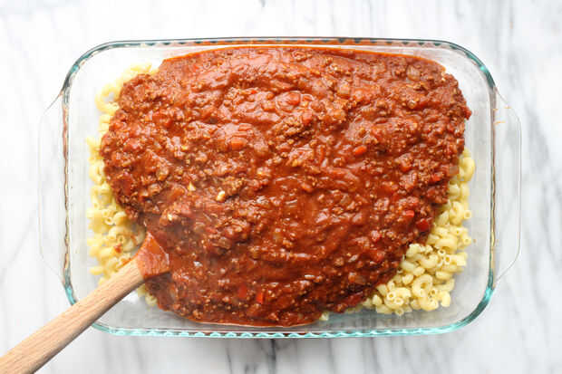 Vierta el codo macarrones en el plato para hornear de 9 x 13 y parte superior con el Chile. Mezclar esto, rompiendo cualquier terrón grande.