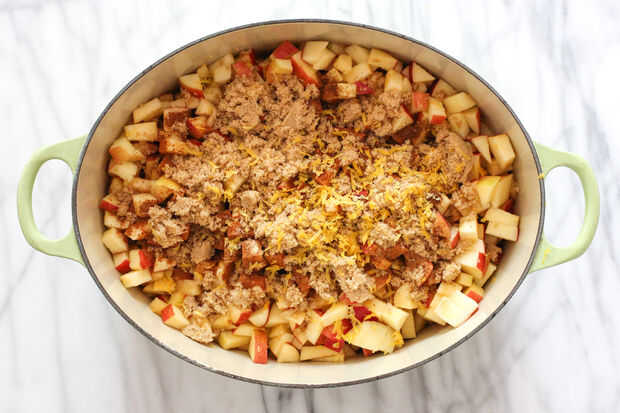 Añadir las especias y el azúcar (recomiendo a partir de una media taza!) y entonces Pele el limón sobre la parte superior. Revuelva para combinar.