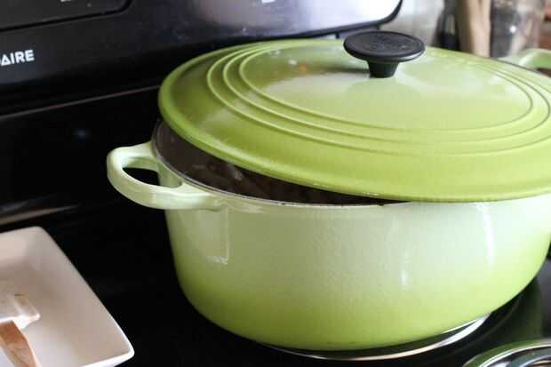 Poner la cacerola sobre fuego medio y deje que el agua llegará hasta una buena burbuja y luego baje el calor un poco. Durante los primeros 45 minutos, me gusta cocinar a fuego lento con la tapa rajada. Los segundo 45 minutos, a tomar la tapa totalmente apagado.