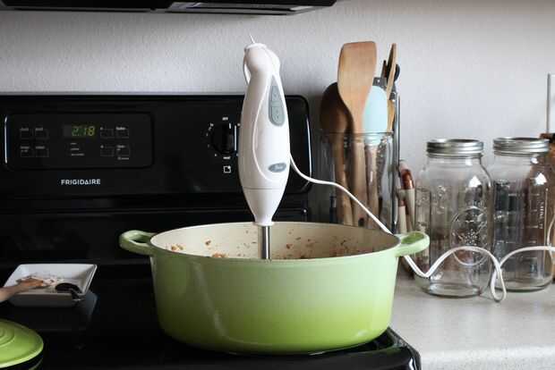 Se puede utilizar un pasapurés, un tamiz, una licuadora de inmersión (palillo), una licuadora regular o un procesador de alimentos. Lo que funcione! Estoy usando una licuadora solo porque es fácil. :)