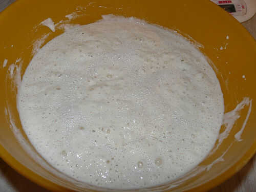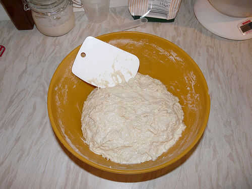 Esta receta es una masa pegajosa húmeda, en las primeras fases de amasado puede ser desordenado y difícil de manejar. Palillo con él aunque, como los cambios de la consistencia será más manejable. (Vea foto abajo mostrando masa mezclada, es aspecto brillante es debido a la mezcla húmeda)