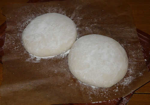 Enrolle la masa desmontada en una bola y dividir en dos. Harina de las manos y la encimera de la cocina para evitar que