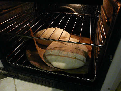 Transferir un pan cuidadosamente levantado en el horno se hace mejor con una cáscara de pizza bien enharinada.