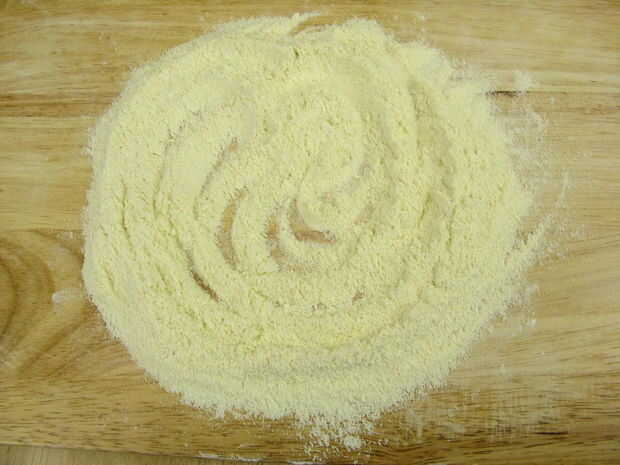 Mida la harina, la sémola y la sal en un gran tazón de fuente y luego dan una agitación rápida con la mano para combinar.