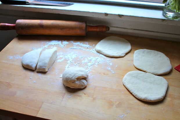 Rollo de cada uno de los pedazos hacia fuera hasta que son 1/2 pulgada o menos delgada. Me gusta mi naan que bastante grasa (siempre entre 1/4-1/2 pulgada de espesor), pero usted puede rodarlo hacia fuera fino estupendo de naan crujiente, también!