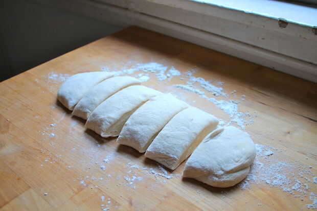 Me gusta mi masa del rodillo y luego cortarlo en seis trozos iguales, pero usted podría hacer cualquier número, realmente!