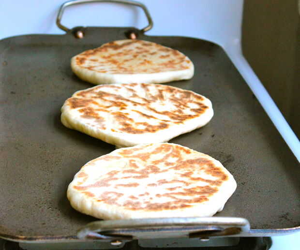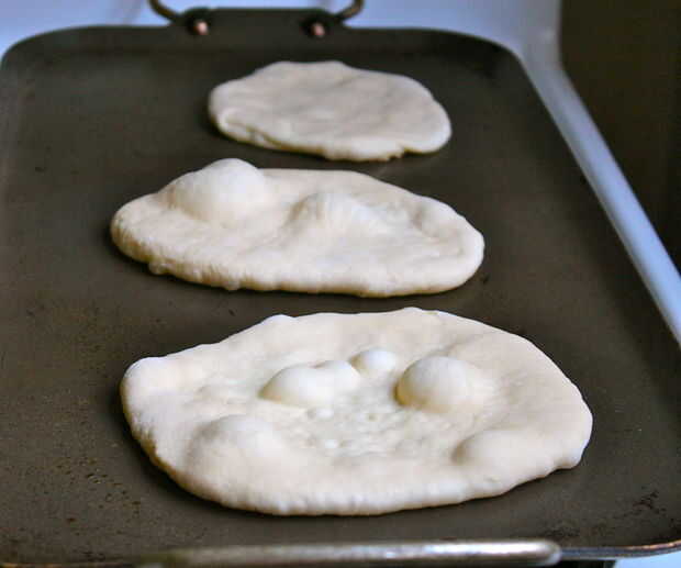 Cuando agradable y caliente, frote un poco de agua sobre el lado del naan que quiere cocinar primero. Echar en la plancha y lo deje reposar durante 1-2 minutos, o hasta grandes burbujas empiezan a formar. Frote la parte superior con agua y voltear. Cocinar por otros 2 minutos o así, hasta que llegue el color que desee.