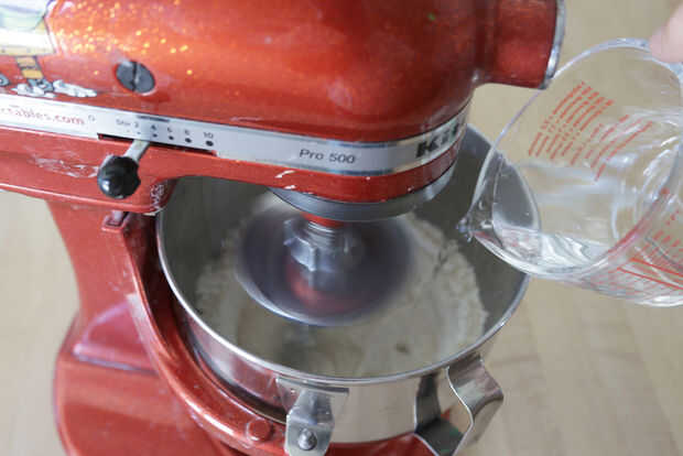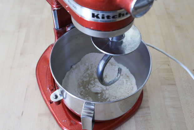 Empezar por poner la harina, levadura, azúcar y la sal en el bol para mezclar y combinar a baja velocidad. Lentamente Vierta en una taza de agua tibia hasta hacer una masa bien consistente. Usted no desea que la masa sea demasiado suave, pero si por error terminan verter demasiada agua, no te preocupes, pasa todo el tiempo. Sólo tiene que añadir más harina.