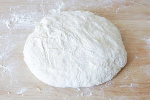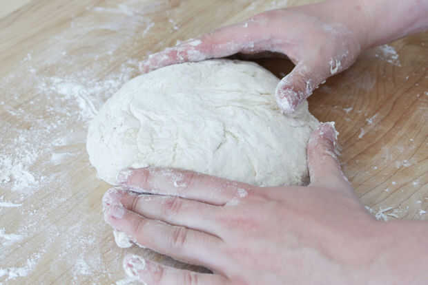 Cuando termines de mezcla y la masa es un poco pegajosos pero no significativamente se pegue a las manos, empezar a amasar con un poco de harina y forma una bola.
