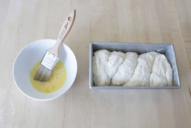 Tome un huevo y batirlo. Cepillo en la parte superior del pan para darle un buen huevo lavado esmalte. Hacer esto le dará su pan un bonito color después hornea. Si usted es alérgico a los huevos, usted puede hacer esto con aceite o simplemente omitir este paso