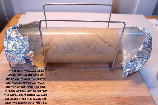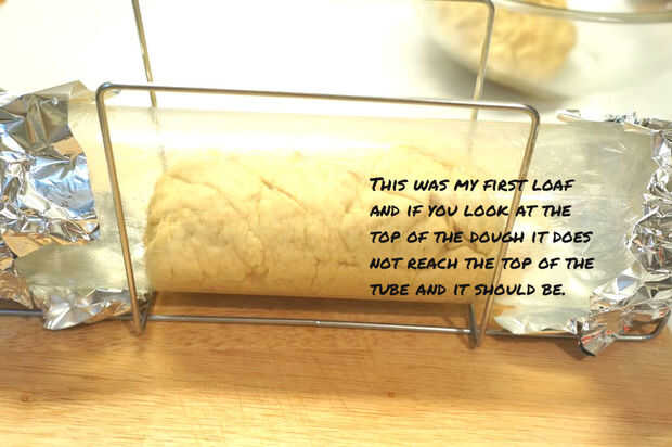 Usando ambas manos, pegarlas en los extremos del tubo y empujar la masa hacia el centro del tubo para que la masa esté tocando la parte superior del tubo. Si no haces esto; la masa no podría aumentar para formar la bonita forma redonda. Lo sé porque esto me pasó y tuve que hacer otro pan para este instructable porque la forma no era redonda.