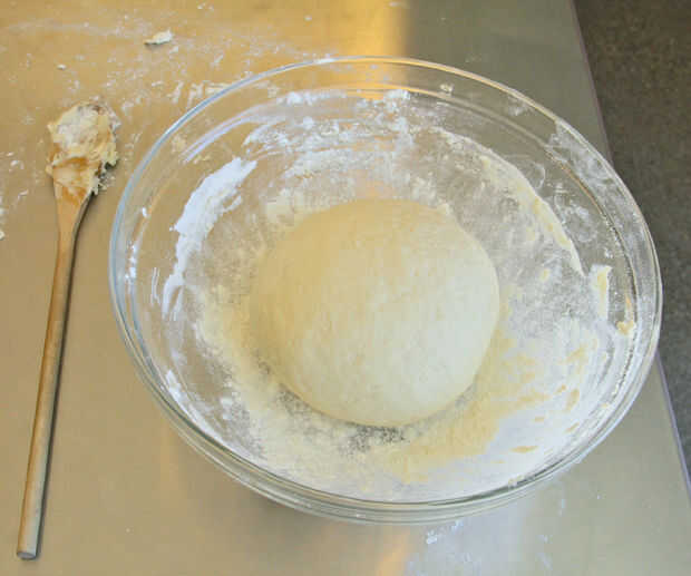 Formar la masa en una bola. Espolvorear harina en le recipiente y colocar la masa en parte superior. Cubrir con una toalla o alguna envoltura de plástico y en un lugar cálido.
