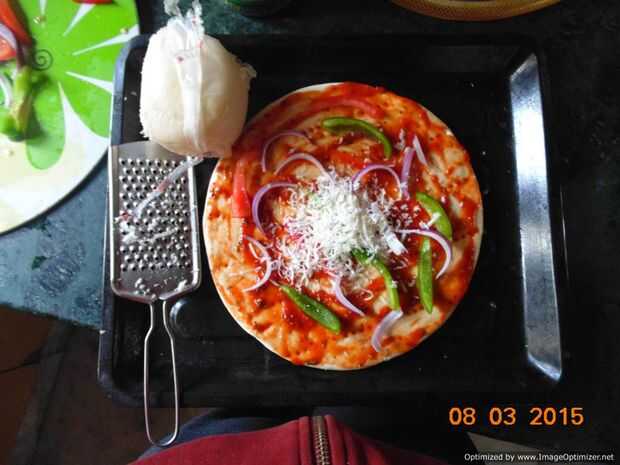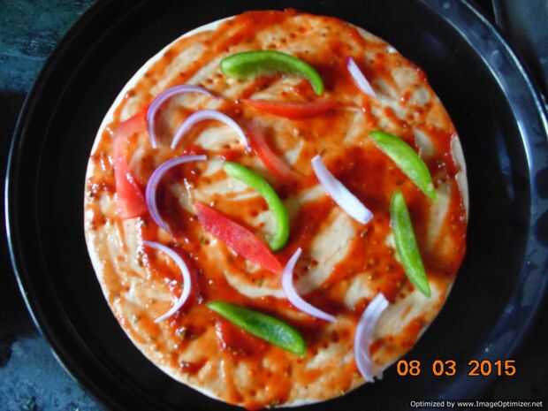 Ahora tome la salsa y extenderlo sobre la base de Pizza como en la imagen. Tomar las verduras y dispersan, sobre la base de pizza.