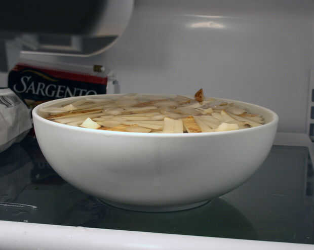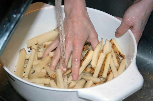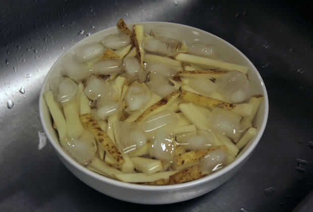 Enjuague corta las patatas en un recipiente grande con abundante agua corriente fría y cubrir con agua y hielo. Refrigerar al menos 30 minutos.