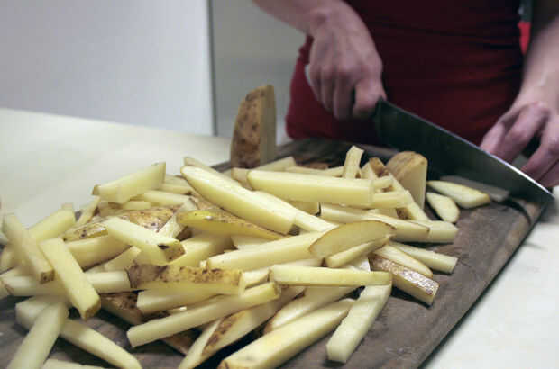 Cortar las patatas en 1/4" formas de freír. O más gordo si te gusta "steak fries." Me gusta em delgado y crujiente!