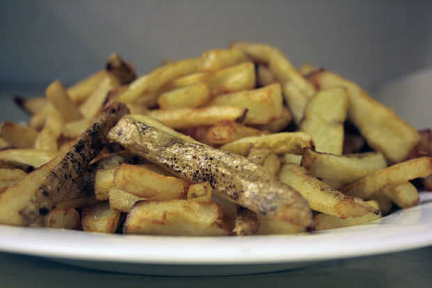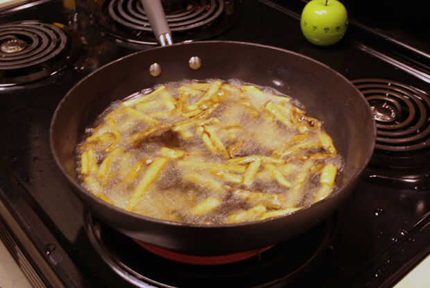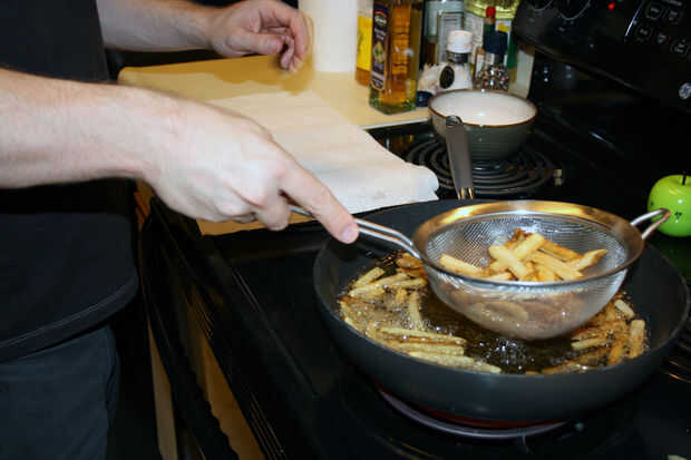 Transferir las papas al aceite caliente y freír, revolviendo frecuentemente, hasta que te gusta lo que miran, 1-5 minutos. Me gusta em casi quemado, así que salí bastante largo.