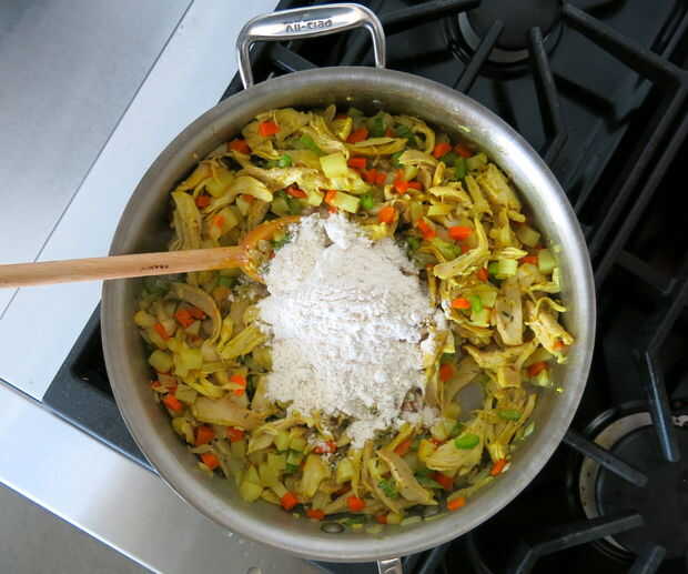 Ahora Vierta el caldo y revuelva muy bien. Dispersar cualquier grumos de harina que vea y deje que la mezcla encima de una burbuja. Esto ayudará a espesarlo.
