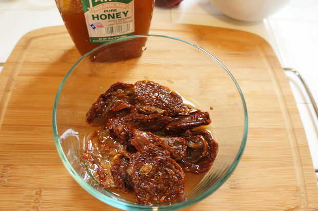 Trocear los frutos secos, albahaca, tomillo, orégano, ajo picado, dados los tomates secada al sol y agregar miel cruda, sal y un poco de agua.