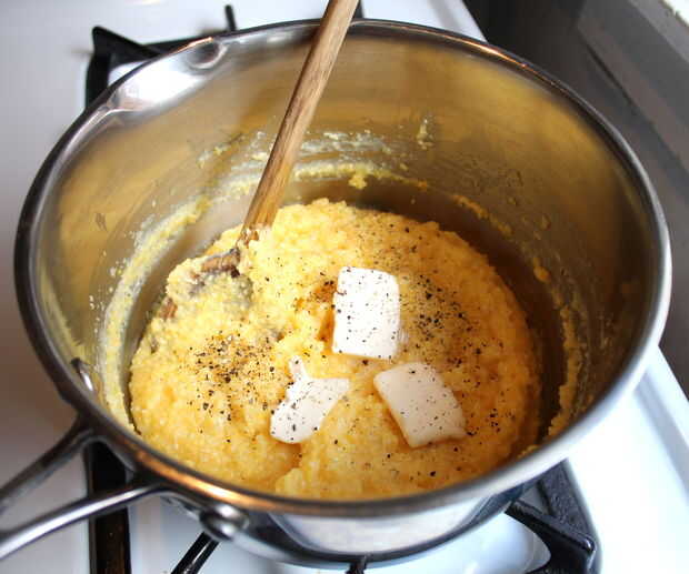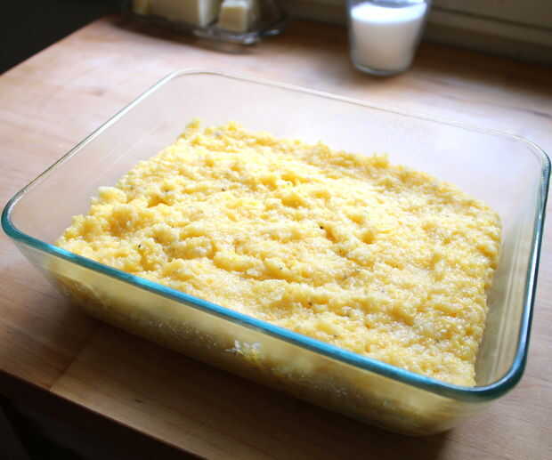 También puede verter en un recipiente rectangular o cuadrado y deje que se enfríe en la nevera para agradables láminas para lasaña o freír. Es todo a usted. : D