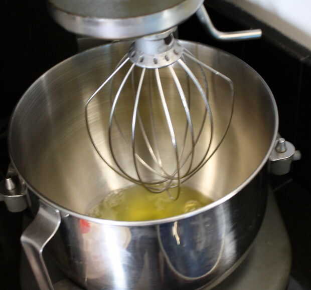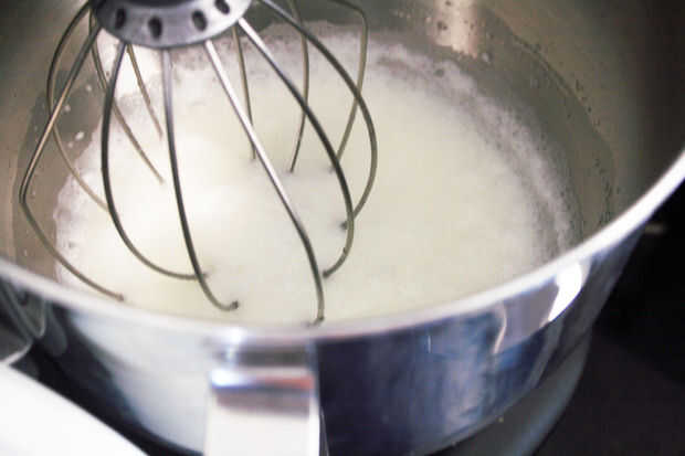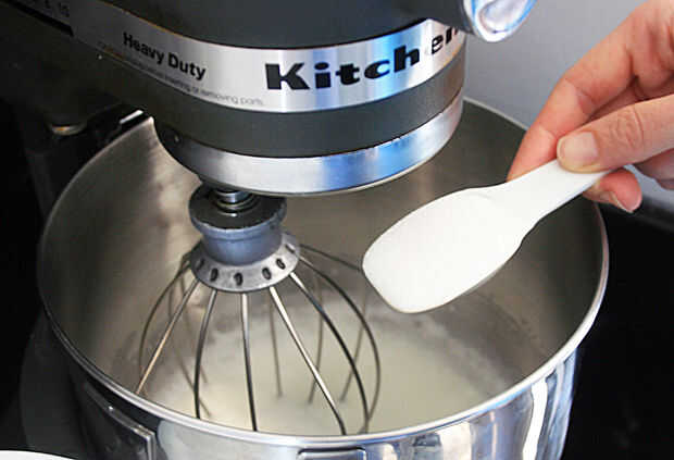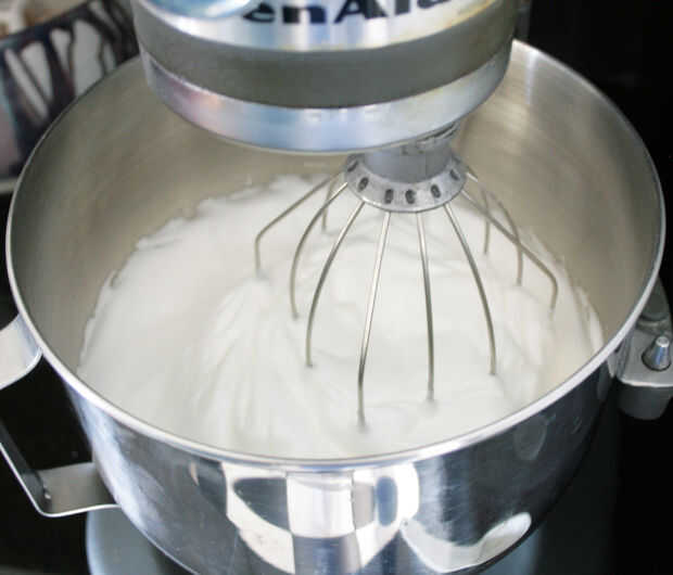 Añadir 6T azúcar, una cucharada a la vez, como el mezclador. Continuar batiendo hasta que la mezcla forme picos rígidos, pero todavía se ve húmedo (otro 2-4 minutos). Ver la última foto a ver como dura la mezcla es como que sacar fuera el Bol.