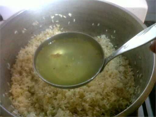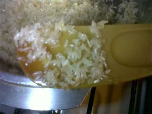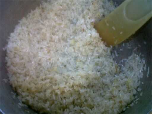 No tienes que quemar el arroz, hasta que el arroz sería transparente / translúcido... Luego baje el fuego y añadir uno o dos