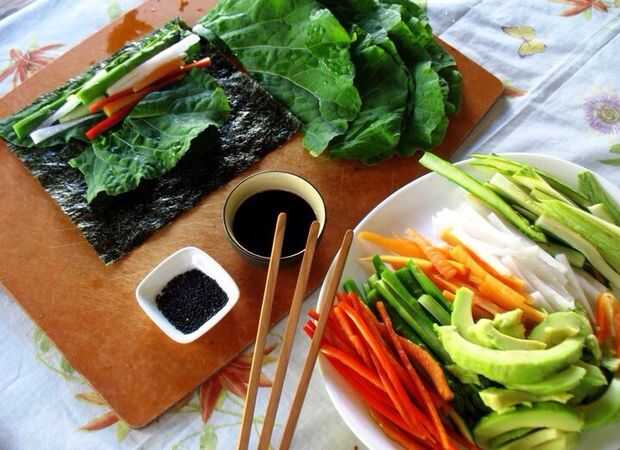 • una variedad de verduras en juliana de su elección: pimiento rojo y amarillo, zanahorias, pepinos, daikon, espárrago o palta