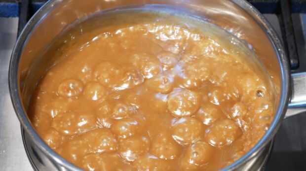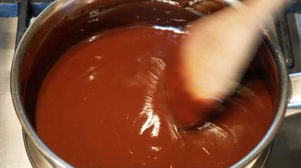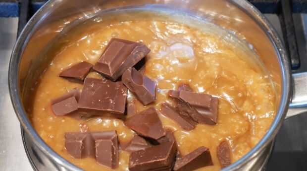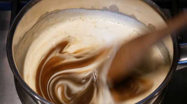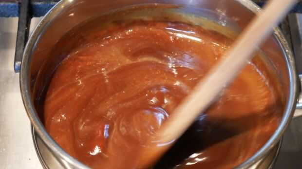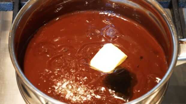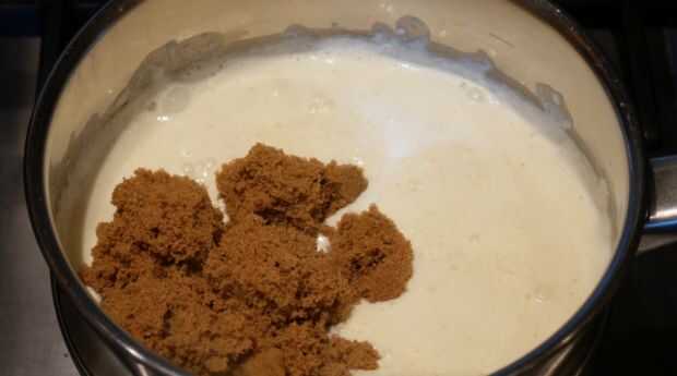 Poner la crema de leche a hervir. Reducir el calor y añadir el azúcar moreno. Una vez combinados, añadir el chocolate negro y removemos bien. Terminar agregando el jarabe, mantequilla, vainilla y sal.